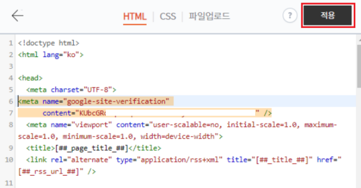 저희가 복사한 태그는 meta태그이므로 같은 속성을 가진 태그들이 모여 있는 곳에 붙여 넣겠습니다. 붙여 넣었다면 우측 상단 적용 버튼을 눌러주세요.