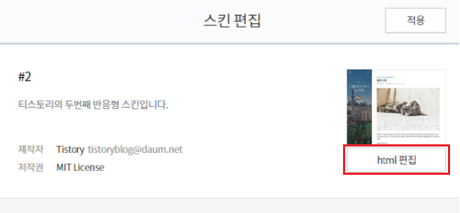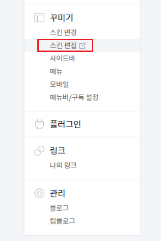 티스토리 관리창으로 들어와 꾸미기-스킨 편집을 눌러주세요.