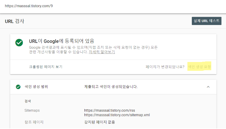 색인 생성 요청을 해줍니다. 저는 미리 등록을 해놓았기 때문에 '등록되어 있음'이라고 표시되어 있지만 처음 하게 되면 '등록할 수 있음'이라고 표시되어 있을 겁니다.