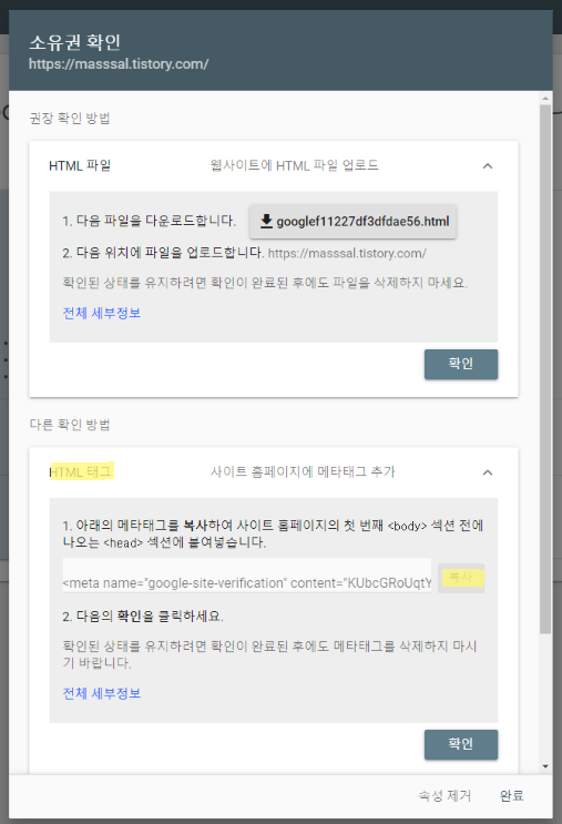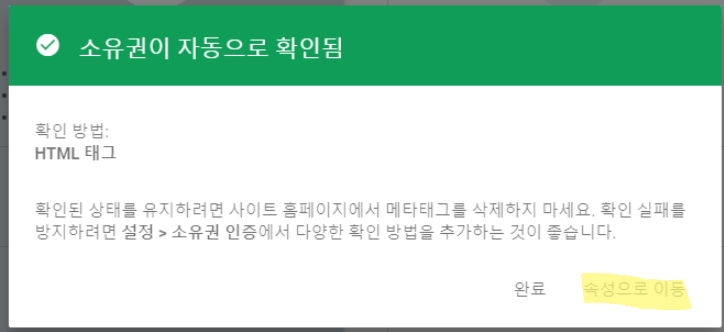 위와 같은 메시지가 나오게 되면 성공적으로 소유권 확인 끝났습니다.