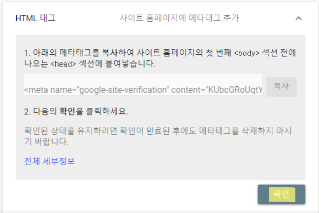 다시 구글 서치 콘솔 웹페이지로 돌아와 확인 버튼을 눌러줍니다.