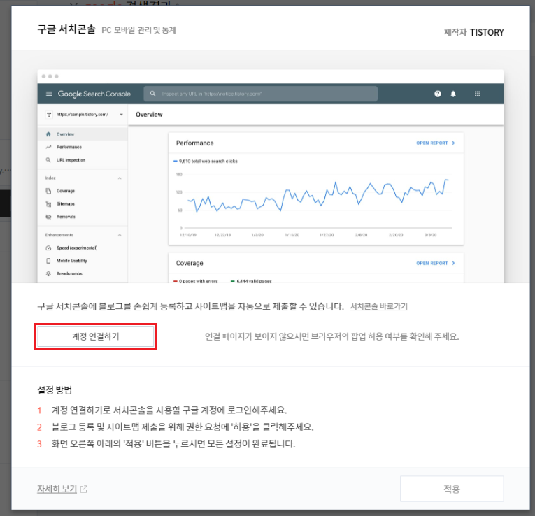 URL 입력창에는 위 예시와 같이 티스토리 주소를 입력해주시고 계속 버튼을 눌러 진행해주세요.