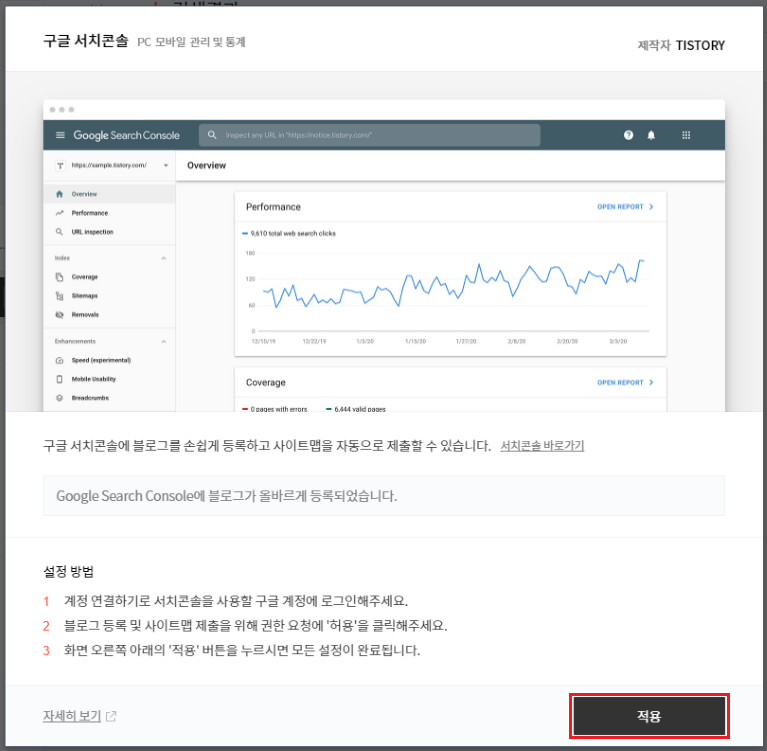 로그인이 성공하면 올바르게 등록되었다고 출력됩니다. 적용을 눌러줍니다. 그러면 구글 서치콘솔 웹페이지에 티스토리가 등록된 것을 확인할 수 있습니다. 그리고 아까 웹페이지를 통해 등록하는 방법과 마찬가지로 URL 검사를 통한 색인 생성 요청만 하면 끝이 납니다.