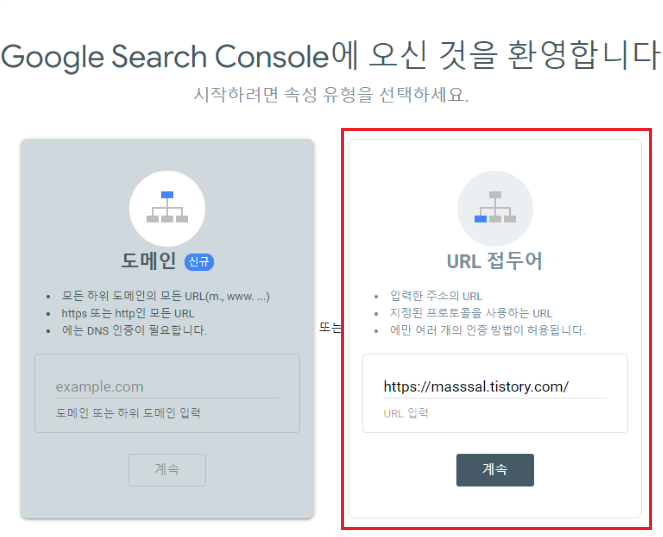 도메인을 구매해서 사용하는 것이 아닌 티스토리 URL 등록이기 때문에 URL 접두어로 등록을 진행하겠습니다.
