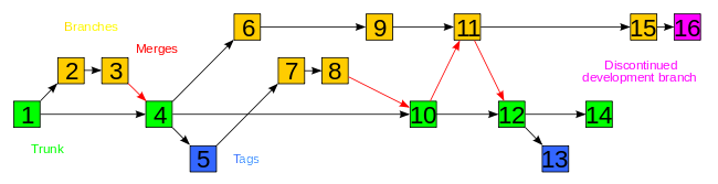 • Branch : trunk에서 분리/복사한 소스로 버전별 배포판을 만들거나 trunk와 별도로 운영환경을 위한 안정화된 소스 관리 목적으로 사용