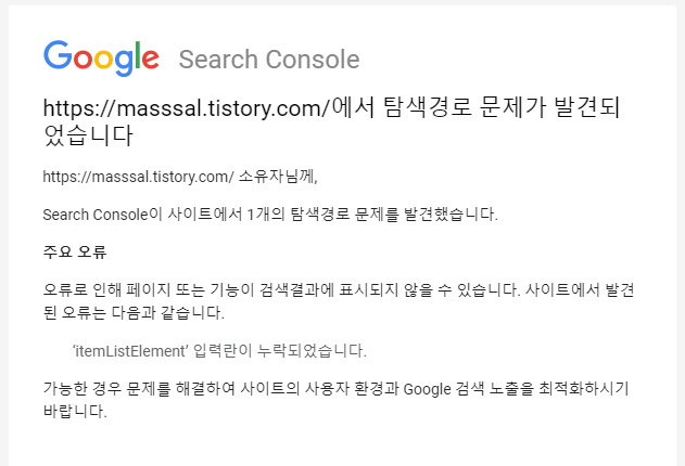 구글 서치 콘솔에서 탐색경로 문제가 발견되었다고 메일이 왔다. 사실 티스토리를 운영하는 사람이라면 한 번쯤 겪는 흔한 이벤트이고 심각한 문제는 아니다. 하지만, 처음 보게 되면 당황스러울 사람에게 도움이 되고자 이번 포스팅을 작성해 보았다.
