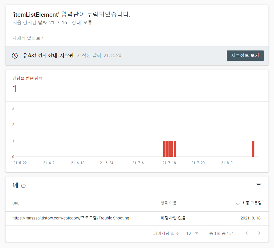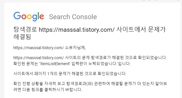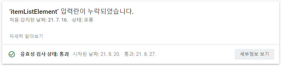 구글 서치 콘솔 사이트로 가서 확인해보니 유효성 검사 상태가 27일 해결되었다고 나와있네요. 이것으로 'itemListElement'입력란 누락 문제를 해결했습니다.