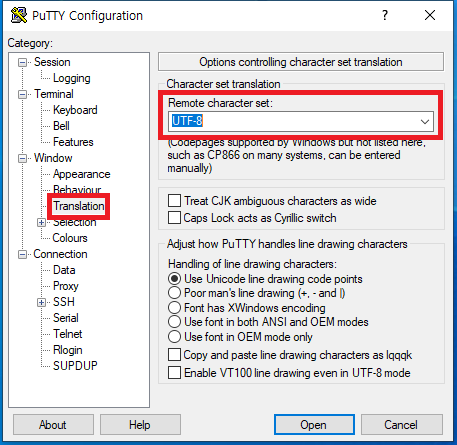 3. PuTTY 설정에서 window - Translaiton으로 들어가 문자 집합 설정에서 확인한 설정으로 바꿔줍니다.